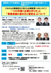 愛媛県よろず支援拠点と愛媛県事業承継・引継ぎ支援センターが連携し、「100年続く企業の作り方」と「事業承継の現状と問題点」についてセミナーを開催いたします。